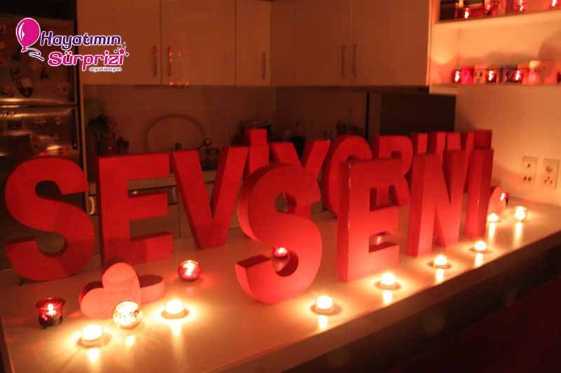 *Gül yaprakları ve mumlarla zemine büyük bir kalp figürü yapıyor, içine aynı malzemelerle isimlerinizin baş harflerini yazıyoruz.