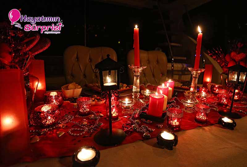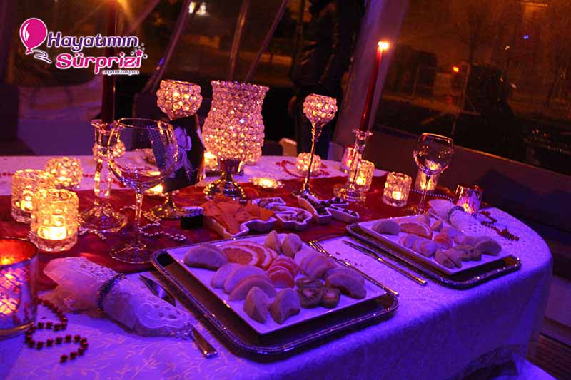 Bu sürpriz organizasyon paketini kısaca Boğaz turu yaparak geçen romantik saatler olarak tanımlayabiliriz. Ama bu romantik saatleri herhangi bir yatta değil ekibimizin sağlam ve güvenli olmasına dikkat ederek seçtiği ve itinayla süslediği bir yatta geçiriyorsunuz. Boğaz turunu tercih etmezseniz tekne, tuttuğumuz süre boyunca limana demirli olarak da kalabiliyor. Organizasyon sırasınca isterseniz baş başa kalıyor, dilerseniz arkadaşlarınızı da bu mutluluk anlarına dahil edebiliyorsunuz. İstediğiniz şarkıları banttan yayınlayabildiğimiz gibi canlı müzikle evlenme teklifi yapmak isteyenler için eğitimli bir müzisyen ayarlayabiliyoruz.