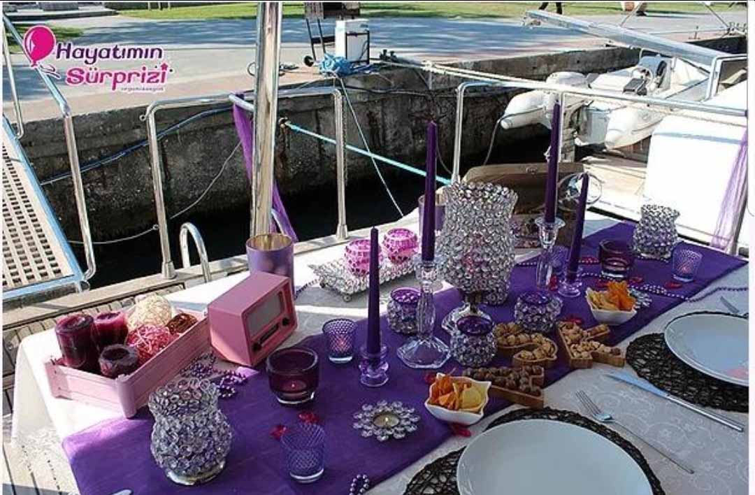 Teknenin içine isteğinize göre kokteyl veya yemek servisi için zevkli bir masa hazırlıyoruz. Masada bulunan yiyecek ve içeceklerin taze ve kaliteli olmasına dikkat ediyoruz, sağlığınız ve keyfiniz bizim için önemli. Sevgilinize “Benimle evlenir misin?” deyip bir evlilik teklifi yüzüğü uzatmanızı takiben balonlarla, ışıklı fenerlerle, volkanlarla ortamı ışıklandırıyoruz. Bunlar bizim yapabileceklerimiz, hangilerinin olup hangilerinin olmayacağı size kalıyor tabii ki. Müşteri memnuniyeti her şeyin üstünde bizim için, bütün detaylar sizin isteklerinize göre şekillendiriliyor.