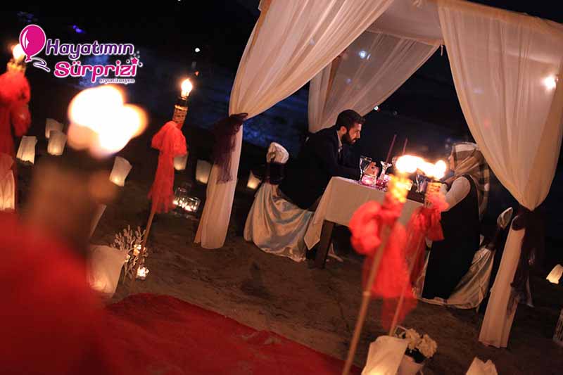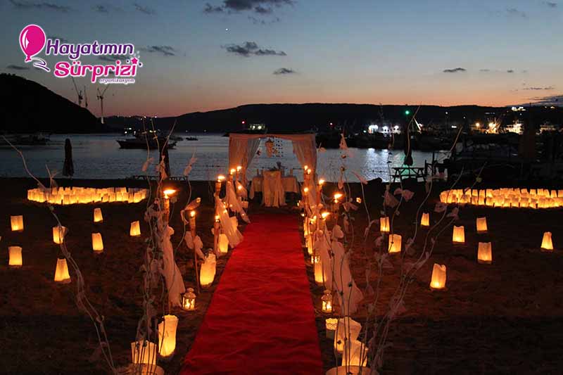 *Akşam saatleri, hava kararmış. İkiniz için kapattığımız kumsal muhteşem görünüyor. Tam bir yıldızların altında evlenme teklifi yapma mekanı. Dalgalar sahile tatlı tatlı vuruyor, uzaklarda şehrin ışıkları, gemilerin ışıkları ve etrafta, kumsalın üstünde bizim sağladığımız mum ışıkları.