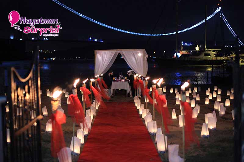 *Sizin için hazırladığımız romantik ortama giden yola bir kırmızı halı seriyoruz. Etrafı fenerler ve meşalelerle donatılmış bir halı bu. Siz halının üstünde sahile doğru yürürken dilerseniz bir müzisyen ikiniz için romantik parçalar çalıyor.