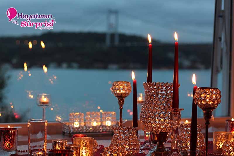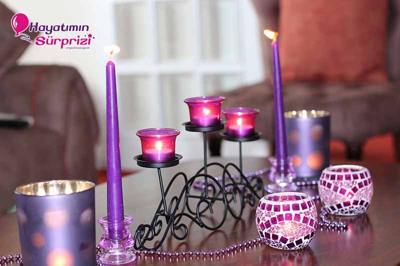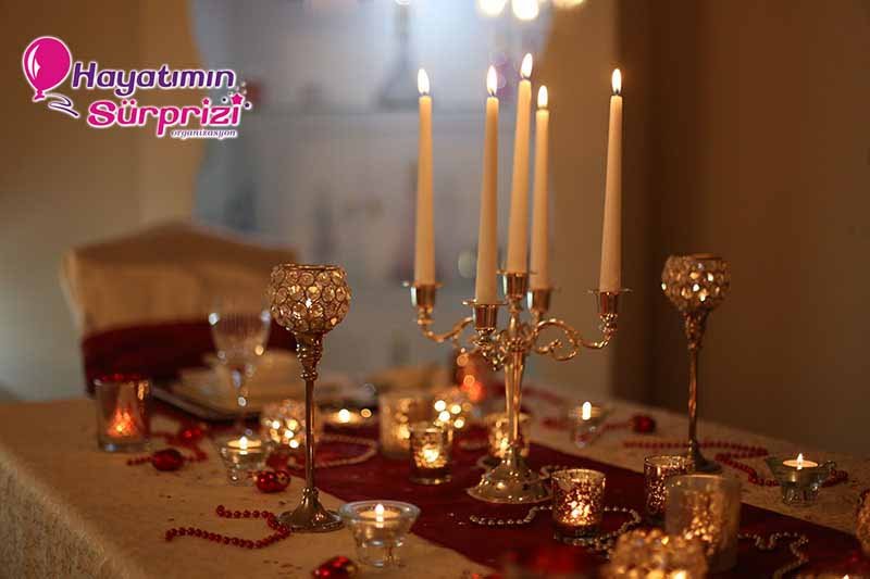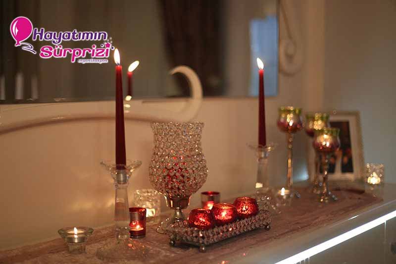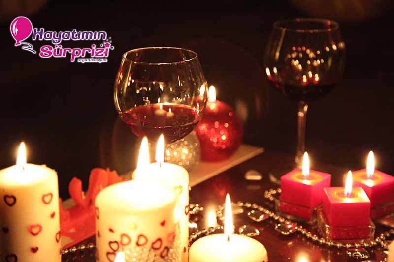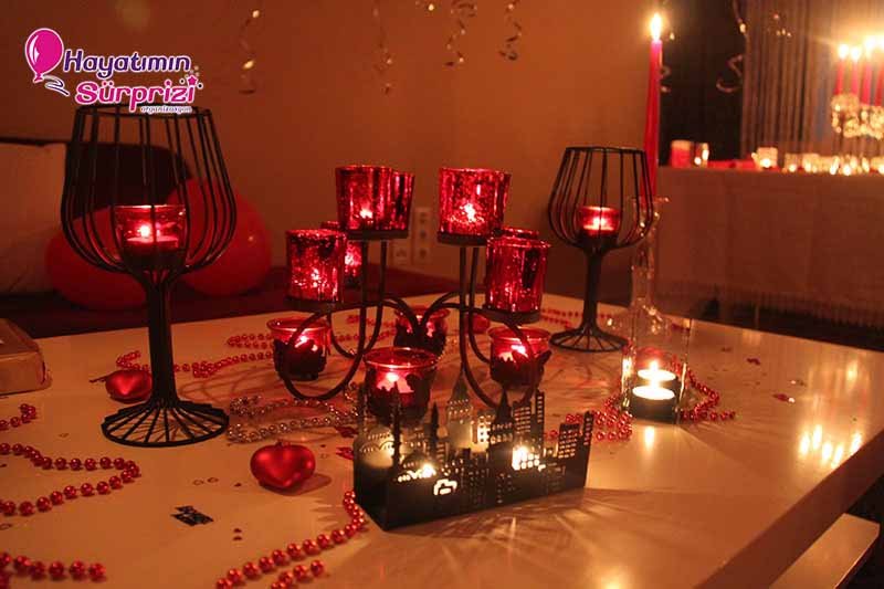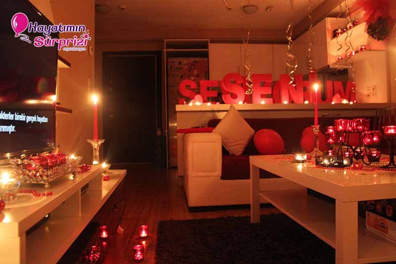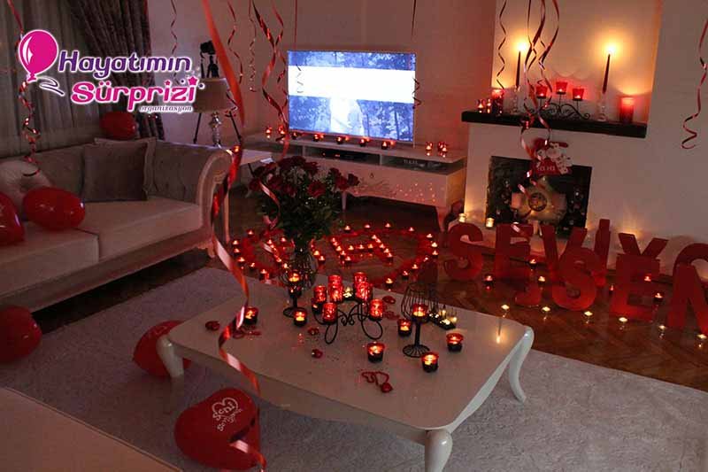 Öncelikle ev / oda süsleme operasyonlarımızdan söz edelim. Bunun için kız arkadaşınıza “14 Şubat’ta müsaitsen bana gelebilir misin?” demeniz gerekiyor. Siz bunu ayarladıktan sonra sıra işin bize düşen kısmına geliyor. Ne yapıyoruz; evinizin uygun gördüğünüz bir odasını ikiniz için müthiş bir sürpriz evlilik teklifi mekanı haline getiriyoruz. Odayı mumlarla, çiçeklerle, balonlarla süslüyor; zemine gül yapraklarıyla kocaman bir kalp figürü yapıp içine isimlerinizin baş harflerini veya “Seni seviyorum” cümlesini yazıyoruz. Dilerseniz beraberce izleyebileceğiniz ikinize özel bir video hazırlıyoruz. Sizin istediğiniz ve bizim de elimizden gelebilecek olan başka şeyler varsa onları da ekliyoruz tabii ki.