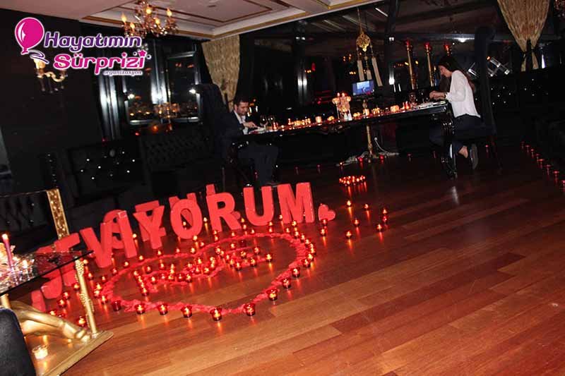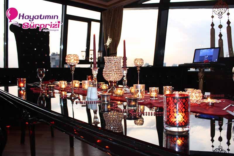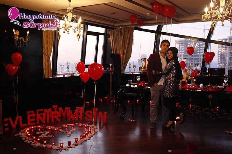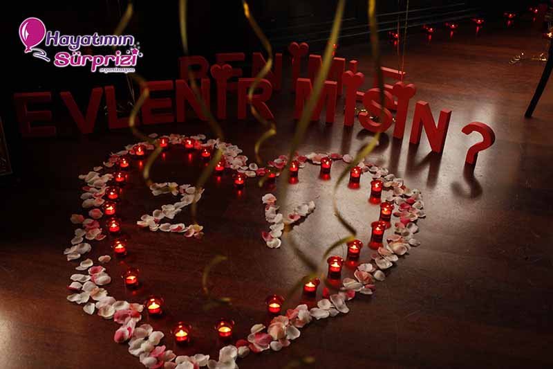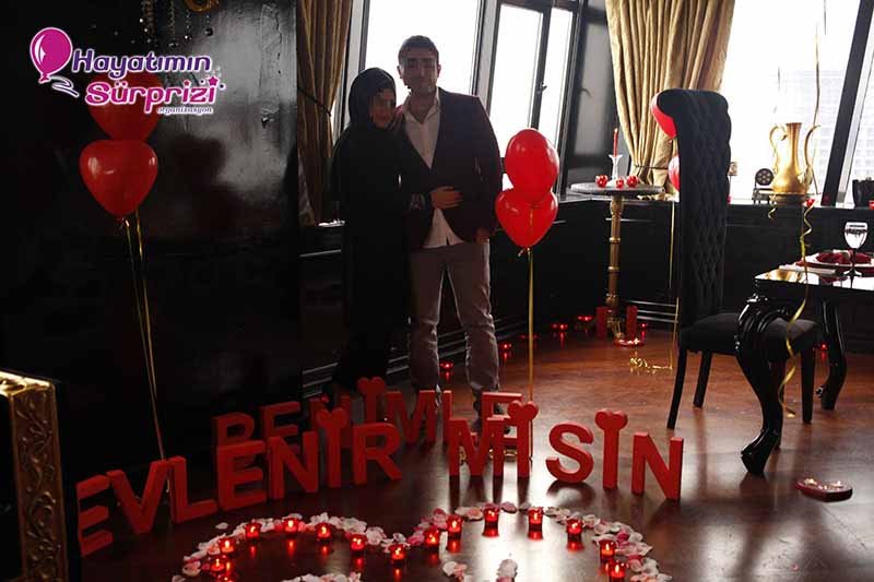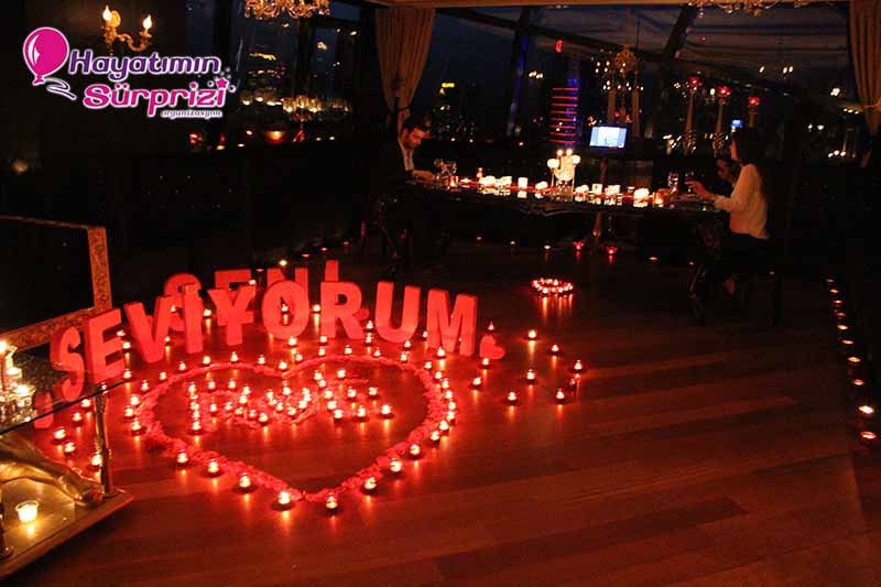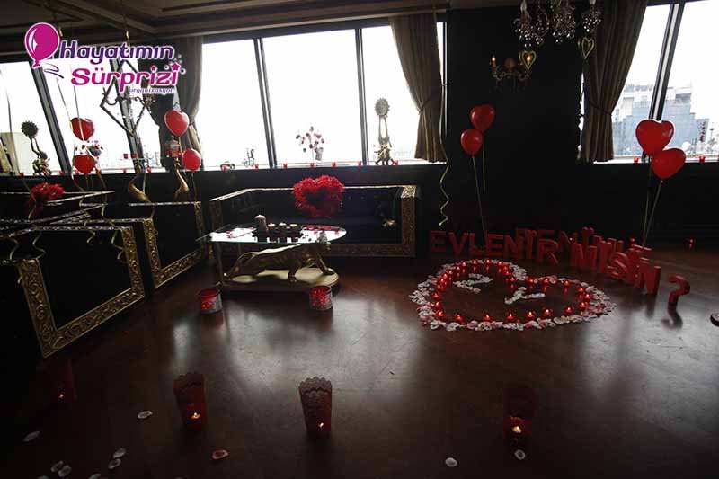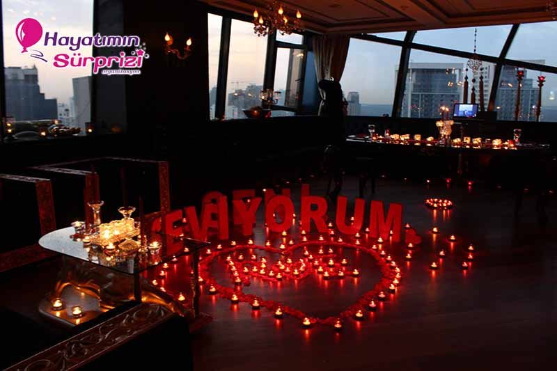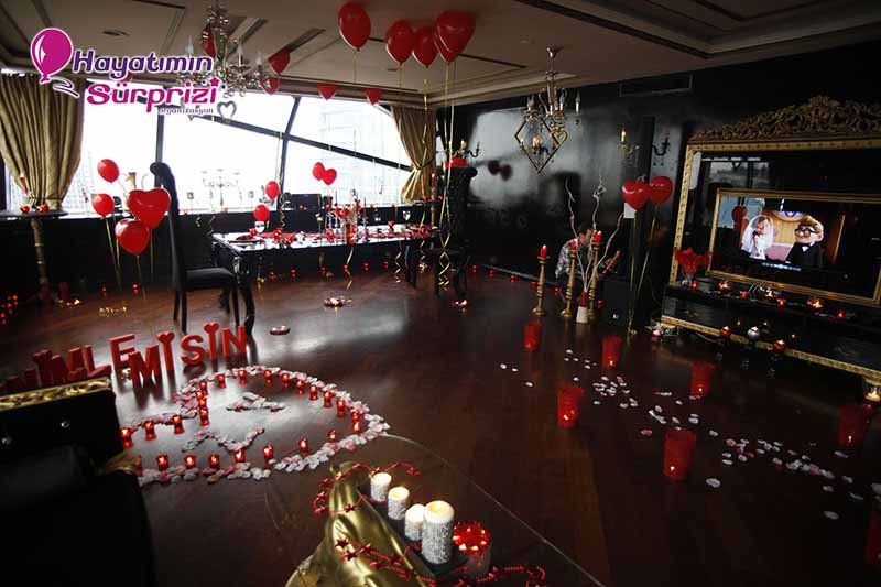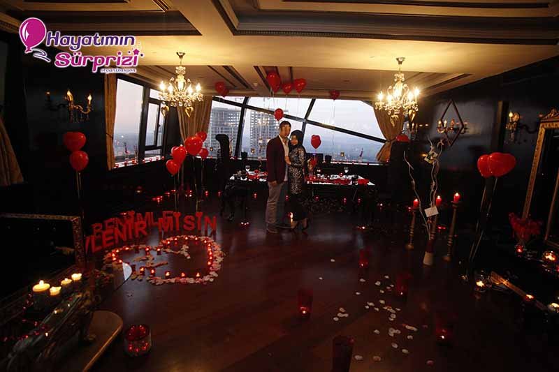 Bu paketi Sheraton Qubbede evlenme teklifi olarak da düşünebilirsiniz; İstanbul Maslak’taki Sheraton Hotel’in 26. Katında bulunan bu görkemli mekan sürpriz evlilik teklifleri için de, başka organizasyonlar için de hizmet veriyor. Sürpriz paketinin ana hatları konusunda biraz aydınlatalım şimdi sizi, sizin hayal ettiğiniz şeyler varsa onlar da ayrıca konuşulabilir. Kına gecesi, düğün veya nişan töreniniz için de İstanbul’un bu popüler ve ihtişamlı mekanını düşünebilirsiniz, aklınızda olsun. Biz paketimize gelelim ama, değil mi? Boğaz’ın muhteşem manzarasına hakim son derecede lüks ve şık bir odada yapılıyor Sheraton’da evlenme teklifi organizasyonu. Şifreli bir kapıdan girilen bu muhteşem odada sizi bekleyen şeylere gelince; 1 dakika lütfen, hangi birini sayacağımıza karar vermeye çalışıyoruz, ondan mı başlasak? Yok, masa süsleme reklamı sonraya kalsın, önce odanın genel görünümünden söz edelim. Odanız kalp şeklindeki balonlarla, etrafında minik mumların yandığı kalplerle, şamdanlarla, çiçeklerle, çiçek yapraklarıyla şahane bir şekilde süsleniyor. Kız arkadaşınız içeriye girince gördüğü şeylerin hangi birine bakacağını, hangi birine hayran olacağını, hangi birine dokunacağını şaşıracak; o derece. Yerlerde köpükten harflerle yazılmış aşk ve / veya evlilik teklifi sözleri, özenle seçilmiş dekoratif aksesuarlar; ne isterseniz. Sadeliği tercih ediyorsanız mümkün, süslü püslü bir mekan istiyorsanız o da mümkün; siz söyleyin, biz en iyi şekilde yaparız, bundan kuşkunuz olmasın.