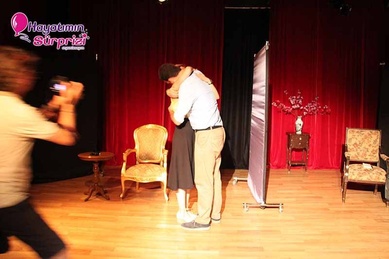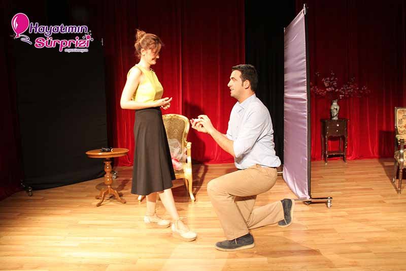 Dilerseniz evlilik teklifiniz yine profesyonel tiyatrocu arkadaşlarımız tarafından sahneden ilan edilebiliyor. Bu senaryoda sergilenen oyunu dilerseniz sevgilinizle baş başa, dilerseniz bu özel anda yanınızda bulunmasını istediğiniz aile üyeleri ve arkadaşlarınızla birlikte izleyebiliyorsunuz.