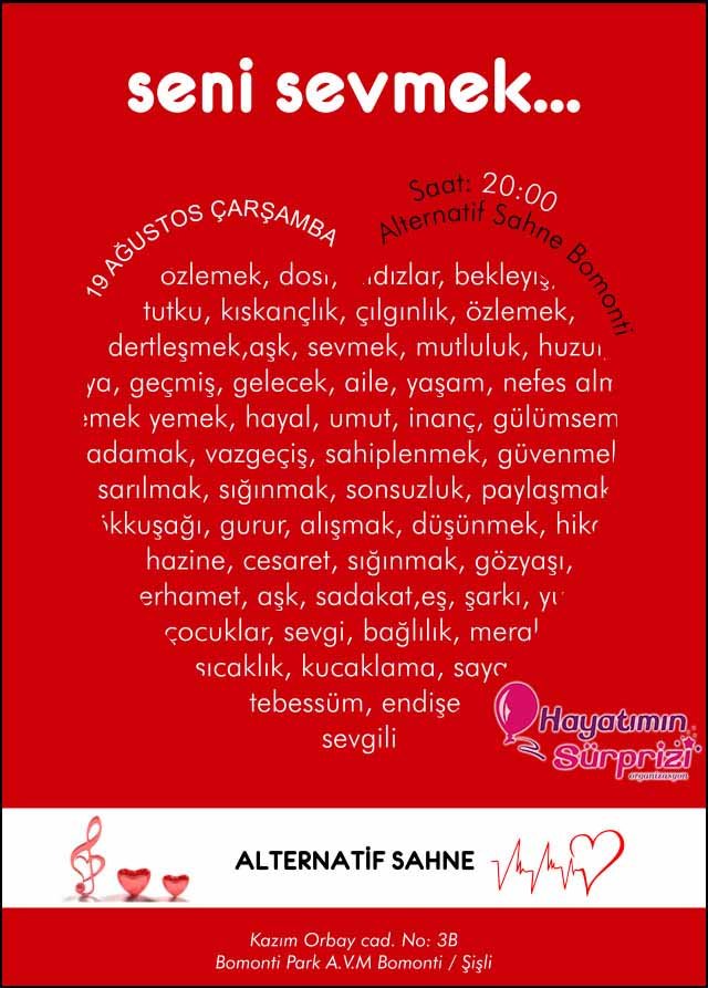 Sizin için anlaşacağımız tiyatro ekibimiz arzu ettiğiniz romantik bir tiyatro oyununu, siz ve sevgiliniz için özel olan bir anınızı ya da bizzat sizin hazırladığınız bir senaryoyu sahnede sizler için canlandırıyorlar.